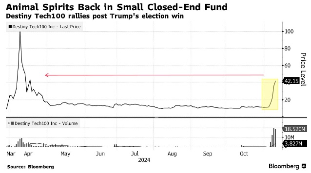 彭博社汇编的数据显示,自特朗普重新当选总统以来,Destiny Tech100 Inc. (DXYZ.US) 的股价在过去一周内已飙升约 280%,该公司持有 SpaceX 和 Sam Altman 的 OpenAI 等私募独角兽的股份。周一的涨势引发了多次波动暂停,并使其股价在上周五上涨 64% 后一度上涨 38% 。与此同时,在加密货币普遍上涨的背景下,狗狗币在周一交易中上涨了近 20%。