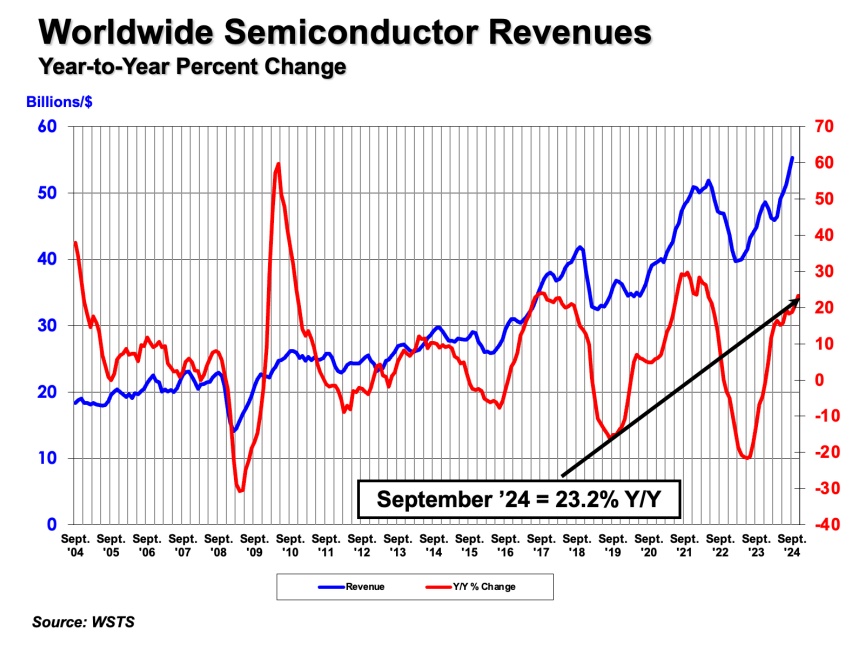 当前数据中心服务器AI芯片,以及存储芯片需求可谓十分强劲,未来很长一段时间可能也是如此。半导体行业协会 (SIA) 近日公布的最新统计数据显示,在英伟达H100/H200等数据中心服务器AI芯片强劲需求带动之下,2024 年第三季度全球半导体市场销售额高达 1660 亿美元,相比于2023年第三季度同比增长23.2%,相比于2024年第二季度本已强劲的销售额则环比增长 10.7%。2024 年9月单月的全球半导体市场的销售额约为 553 亿美元,比2024 年8月的半导体市场销售额531亿美元环比增长 4.1%。