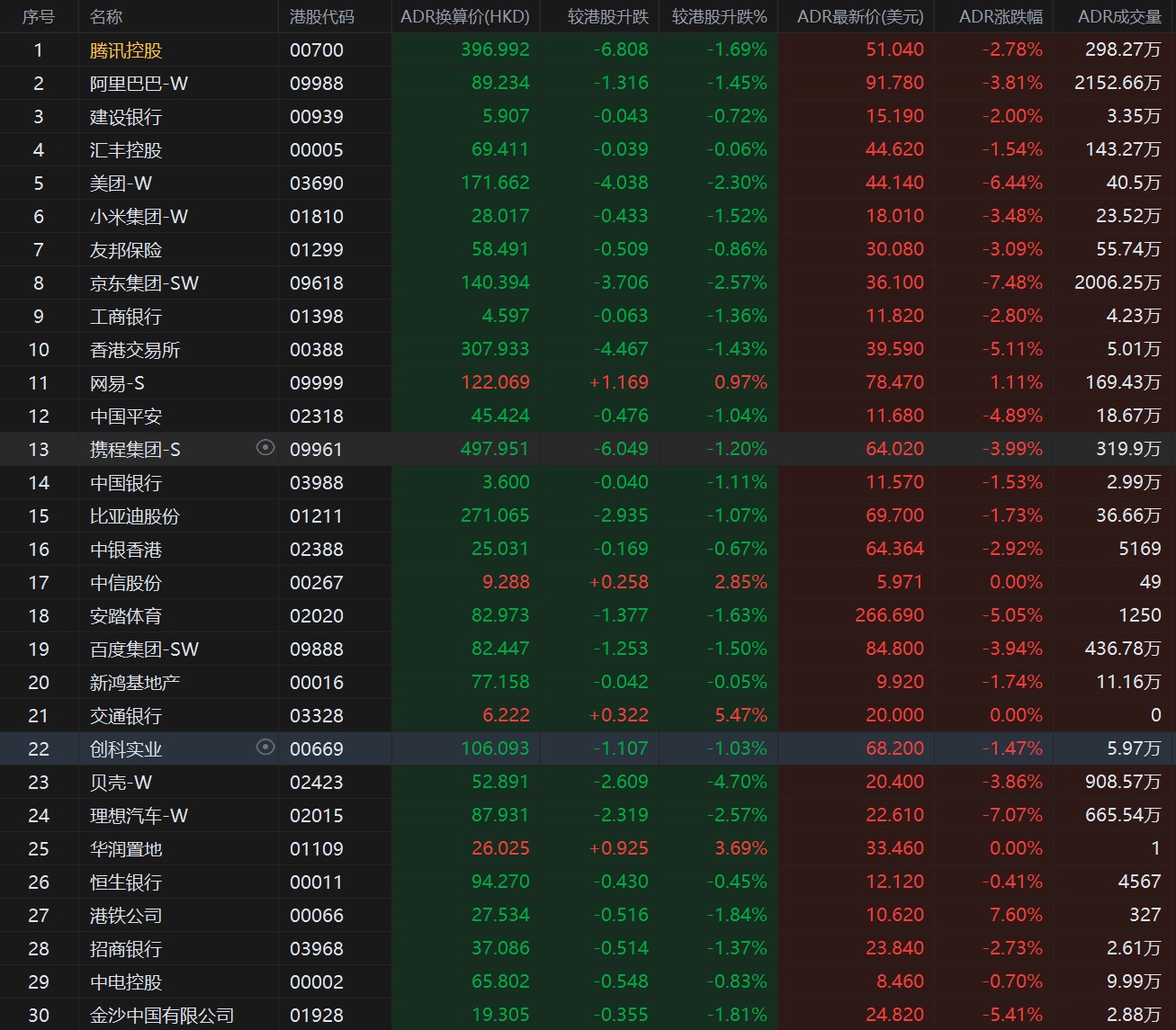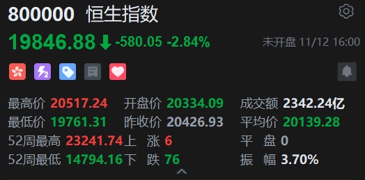 智通财经APP获悉,周二美股三大指数齐跌,恒生指数ADR下跌,按比例计算,收报19846.88点,较香港收市下跌580.05点或2.84%。