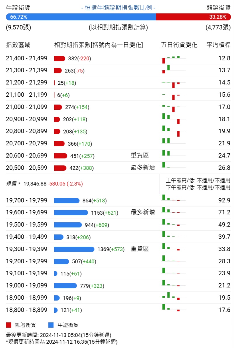 智通财经APP获悉,截至11月13日,恒指最新的牛熊街货比例为67:33。