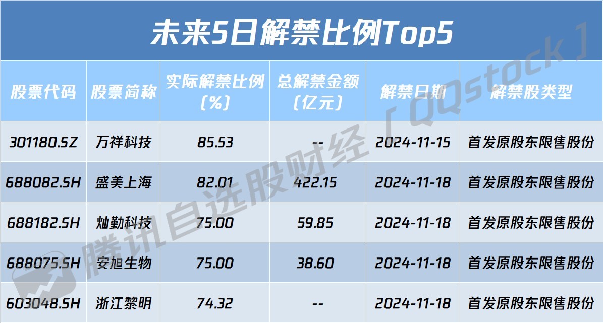 从解禁比例来看,未来5日万祥科技实际解禁比例达85.53%,其次解禁比例居前的分别为盛美上海、灿勤科技。