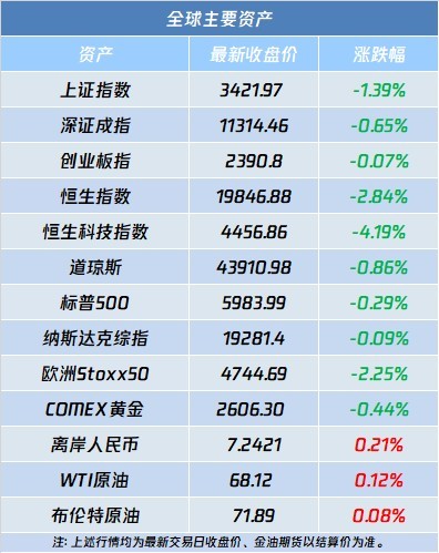自选哥提示:“特朗普交易”降温,美股收跌,标普结束四连涨;人民币资产重挫,中概股指数跌逾4.5%,离岸人民币小幅贬值;黄金期货收跌0.44%,报2606.3美元/盎司;原油期货收于每桶68.12美元,涨幅为0.12%。