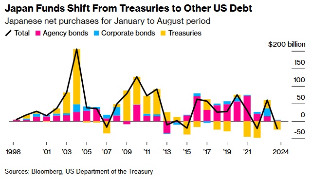 美国财政部的数据显示,今年前三个月,日本投资者是美国国债的净买家,但此后已转为卖家。今年 1 月至 8 月,日本投资者总共出售了价值 244 亿美元的美国国债。