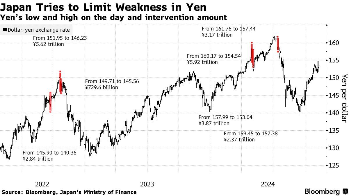 数据显示,日本当局在今年4月底和5月初的干预中花费了创纪录的9.8万亿日元(约合630亿美元)。而在日元兑美元汇率跌至1986年来最低点后,日本当局又在7月初花费了5.5万亿日元进行干预。