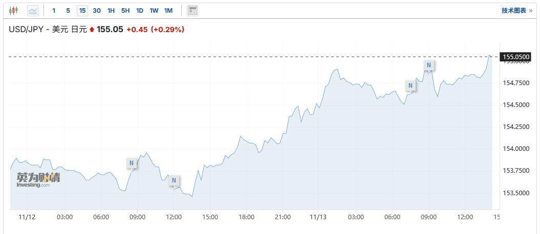 智通财经APP获悉,周三,美元兑日元汇率涨0.29%,至155.05,为7月以来首次突破155这一关口。这加大了日本当局为延缓日元贬值而下场干预的风险。