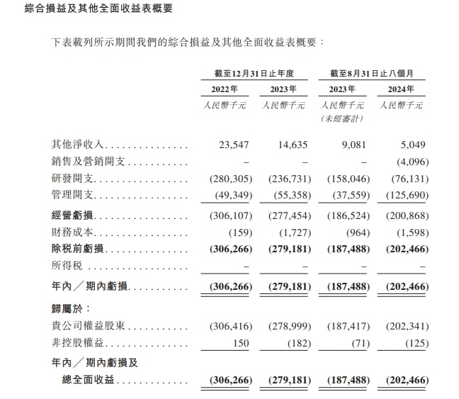 财务方面,派格生物目前尚未盈利。招股书显示,截至2022年度、2023年度及2024年截至8月31日止八个月,公司录得研发开支分别为人民币2.803亿元、人民币2.367亿元及人民币0.761亿元。同期,该公司实现年内/期内利润及全面收益总计分别为-3.06亿元、-2.79亿元及-2.02亿元人民币。