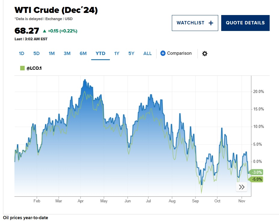 如果在2025年原油价格真的跌至每桶40美元的极端负面水平,那么意味着当前疲软的原油价格将大幅下跌约40%。全球原油基准——布伦特原油目前的期货交易价格徘徊在每桶72美元附近,北美原油定价基准——WTI原油期货价格则徘徊在每桶68美元附近。