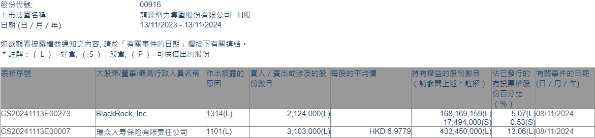 智通财经APP获悉,香港联交所最新资料显示,11月8日,瑞众人寿增持龙源电力(00916)310.3万股,每股作价6.9779港元,总金额约为2165.24万港元。增持后最新持股数目约为4.33亿股,最新持股比例为13.06%。