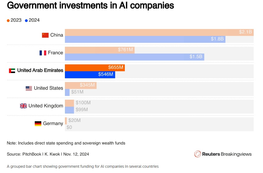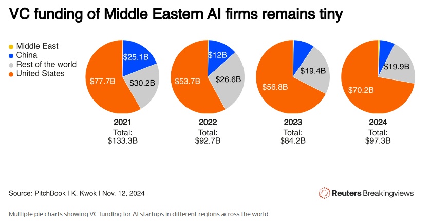 对于富饶的海湾国家而言,非常缺乏那种在AI领域具有强大技术或者融资影响力的私营公司。PitchBook表示,今年到目前为止,风险投资公司仅在中东的AI初创公司投资约7亿美元。不可否认的是,这些国家确实拥有超大规模的国家石油主权基金来支持该地区AI初创公司发展,或者支持英伟达、微软以及谷歌等科技巨头们深耕海湾市场。