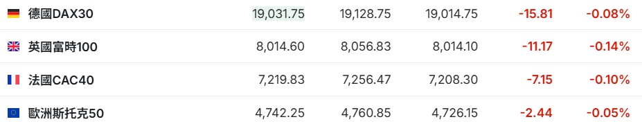 2. 截至发稿,德国DAX指数跌0.08%,英国富时100指数跌0.14%,法国CAC40指数跌0.10%,欧洲斯托克50指数跌0.05%。
