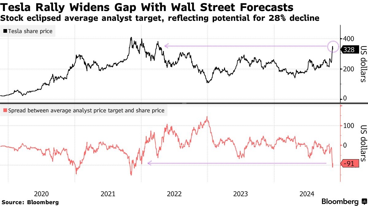 智通财经APP获悉,在埃隆·马斯克对唐纳德·特朗普的全力支持下,特斯拉公司(TSLA.US)股价在大选后飙升近31%,市值激增近2500亿美元,这一非凡涨幅引发了华尔街的广泛关注和谨慎呼吁。尽管特斯拉股价的强劲表现得益于马斯克在新政府效率行动中的领导地位及潜在更友好的监管环境,但分析师和市场参与者对特朗普政府对电动汽车的态度及其潜在政策影响持不同看法,一些人士认为特斯拉股价面临28%的下行空间风险。这是自疫情后科技股狂热以来最大的估值分歧。