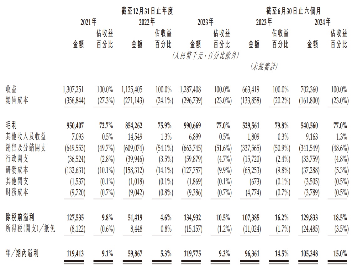 据悉,九源基因的毛利由截至2023年6月30日止六个月的5.30亿元增加2.1%至截至2024年6月30日止六个月的5.41亿元,毛利率由截至2023年6月30日止六个月的79.8%下跌至截至2024年6月30日止六个月的77.0%,主要由于亿喏佳在被纳入国家VBP计划后价格有所下降。