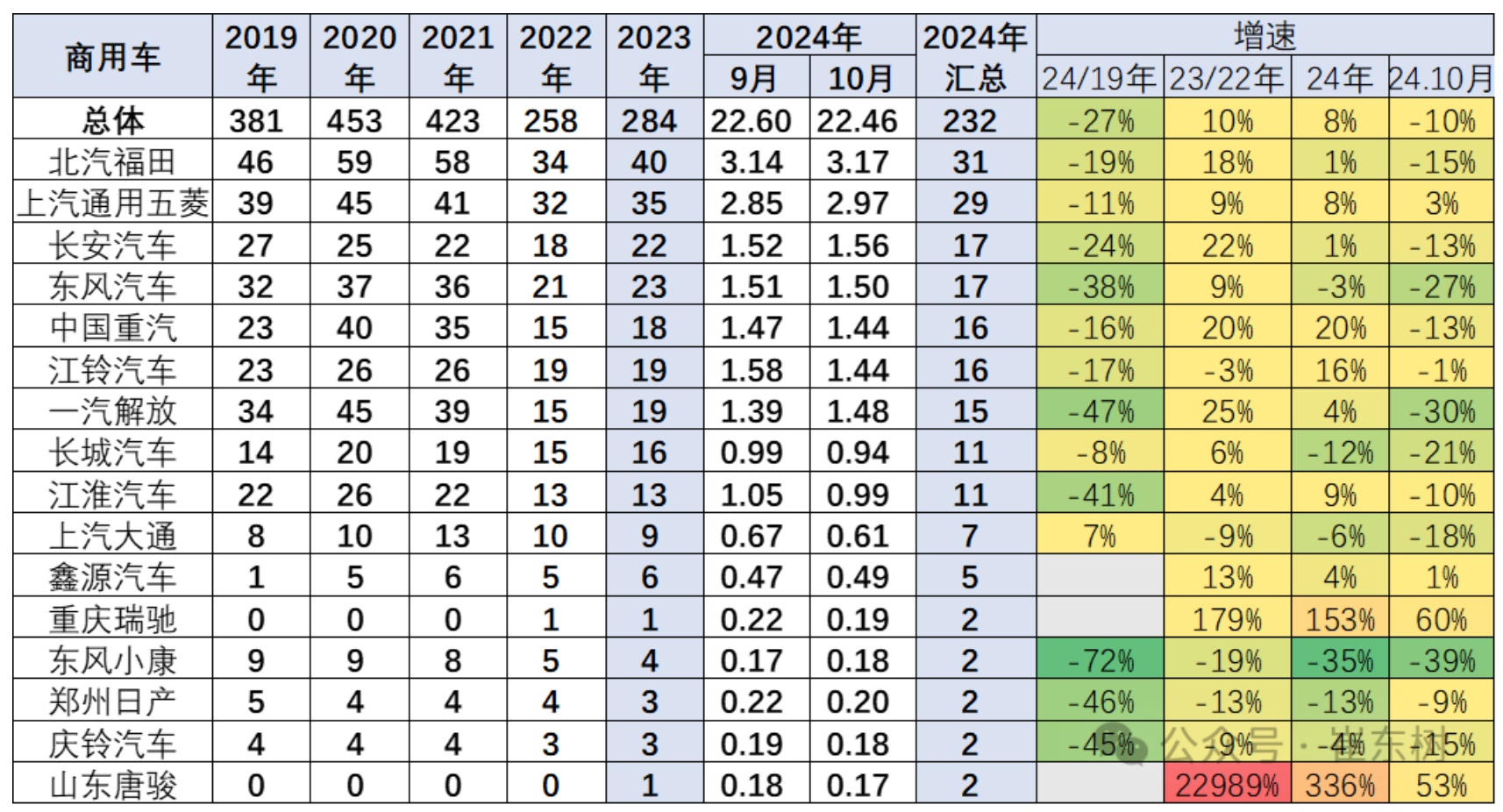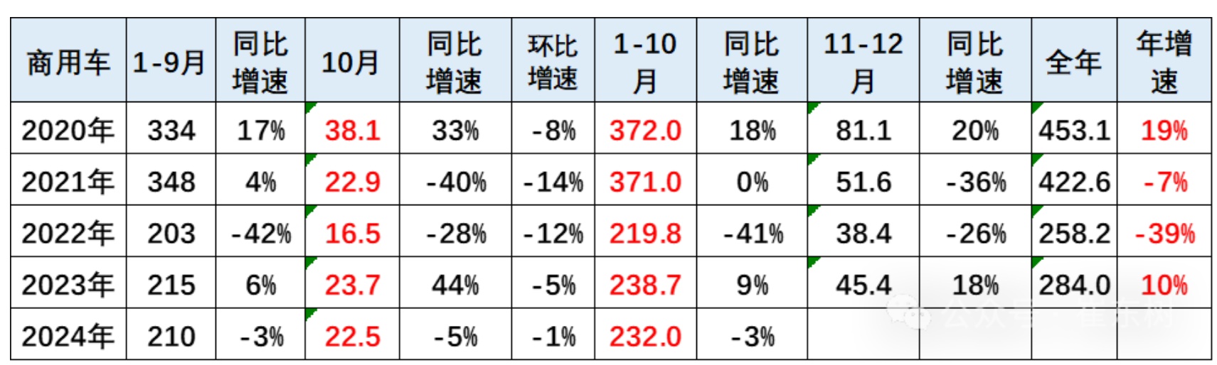 近几年国内商用车市场呈现需求快速下降趋势。从2020年的超高销量,到2021年的政策进入期,2022-2023年处于低谷期,今年1-10月商用车国内保险实现232万台,同比下降3%;10月商用车国内销量实现22.5万台,同比下降5%,环比9月下降1%。
