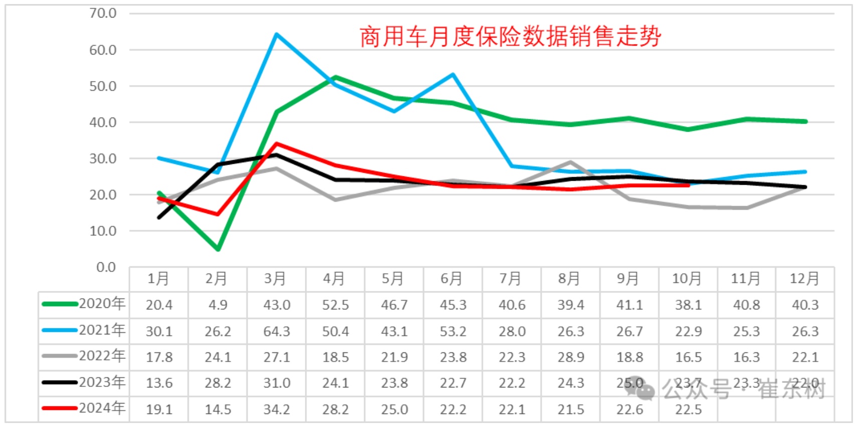 今年商用车车市呈现总体较稳的走势,月度走势与2021年的走势相近,1-3月相对波动较大。由于保险数据异常错位,月度数据环比波动较大。今年10月商用车销量22.5万台,近几个月的商用车持续下行,今年3月后的需求回暖较不明显。