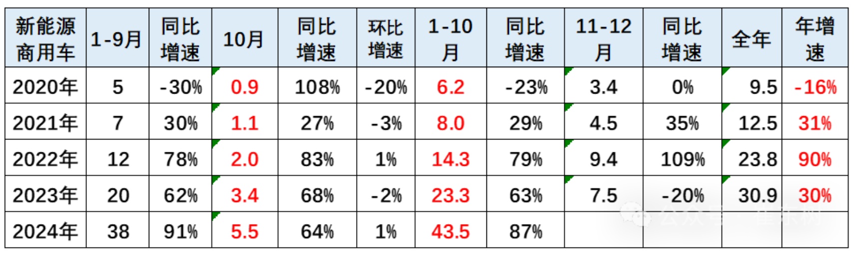 2024年1-10月份新能源商用车销量43.5万台,同比增长87%;2024年10月份达到5.5万台,同比增长64%,表现相对较强,呈现连续补贴退出后的市场良好增长的局面。