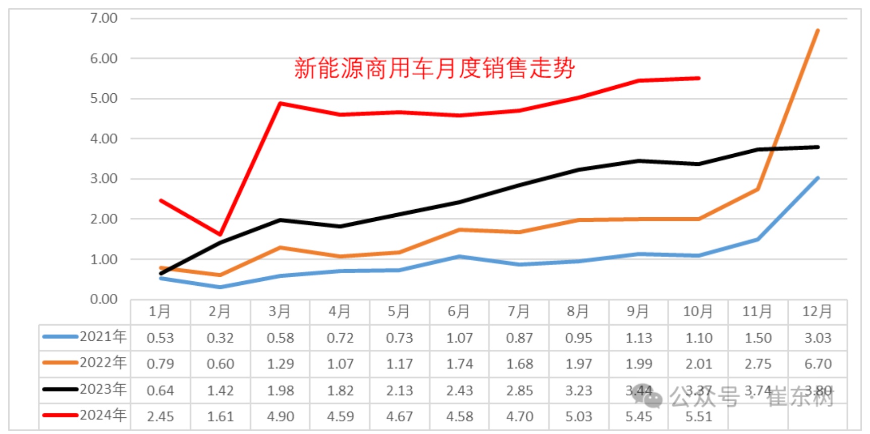 2023年新能源商用车整体呈现1-4月份因补贴退出的影响形成低位,5-12月份又强势增长的特征。2024年1-2月份回归正常月度走势,3-10月节后开局也呈现了快速走强的较好增长局面,尤其是9月和10月的新能源销量出现持续创新高走势,也是很好的表现。