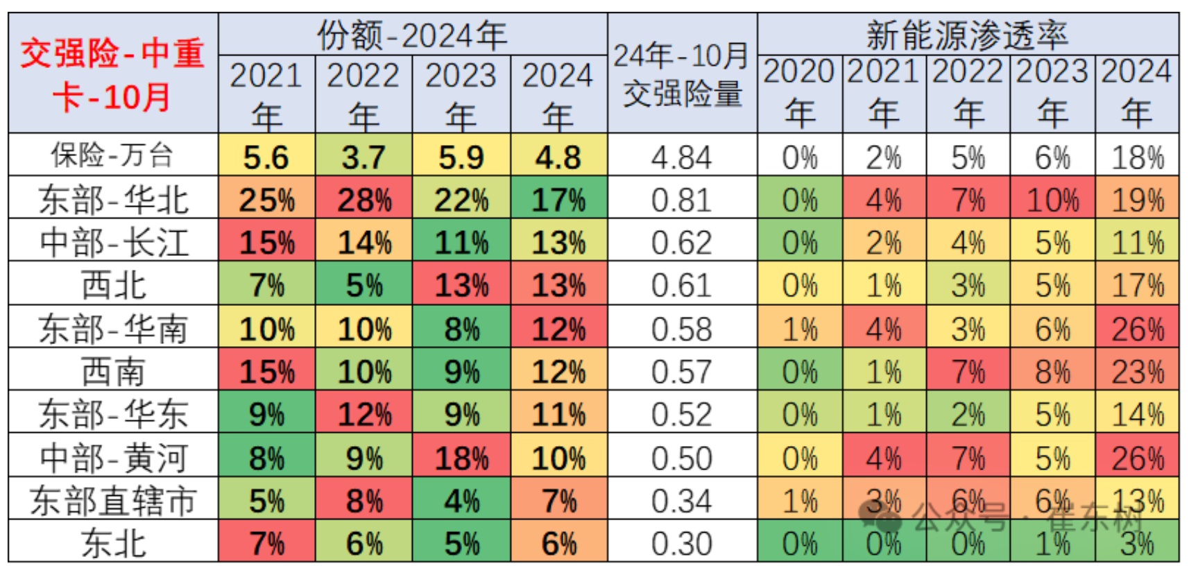 总体中重型卡车在西北、中部长江地区市场、西南市场份额较高。而新能源重卡在中部黄河和西南地区等渗透率表现较好,其中华南地区渗透率提升较快。