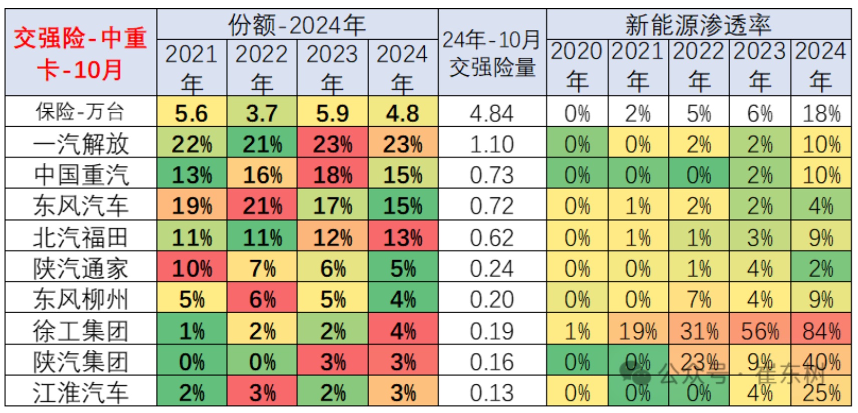 国内市场中重卡市场表现最为优秀的应该是一汽解放、中国重汽、东风汽车等企业,重卡总体表现相对平稳,徐工等部分重卡二线车企电动车渗透率提升。
