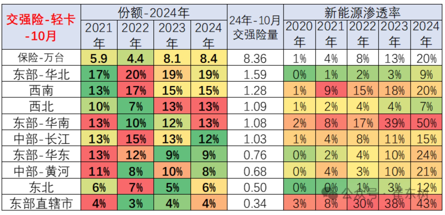 轻卡市场主要是在东部-华北和西南等地区份额较高,但西北地区的轻卡表现逐步走强。