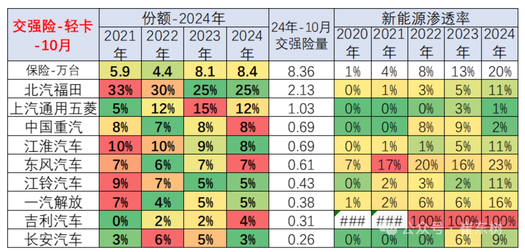 新能源轻卡的主力企业是吉利汽车等,尤其是吉利汽车近两年在新能源轻卡表现相对极其优秀。