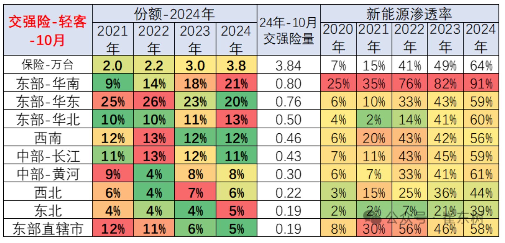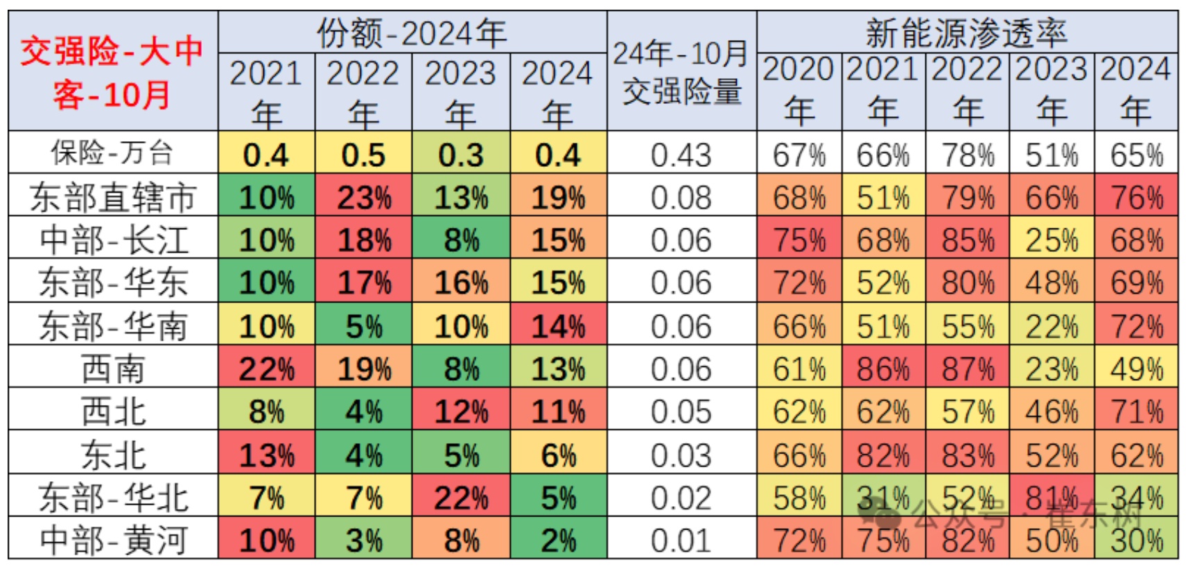 新能源大中客市场渗透率较高的主要是东部-华东、中部-长江、华南市场、京津沪,其它地区表现一般。