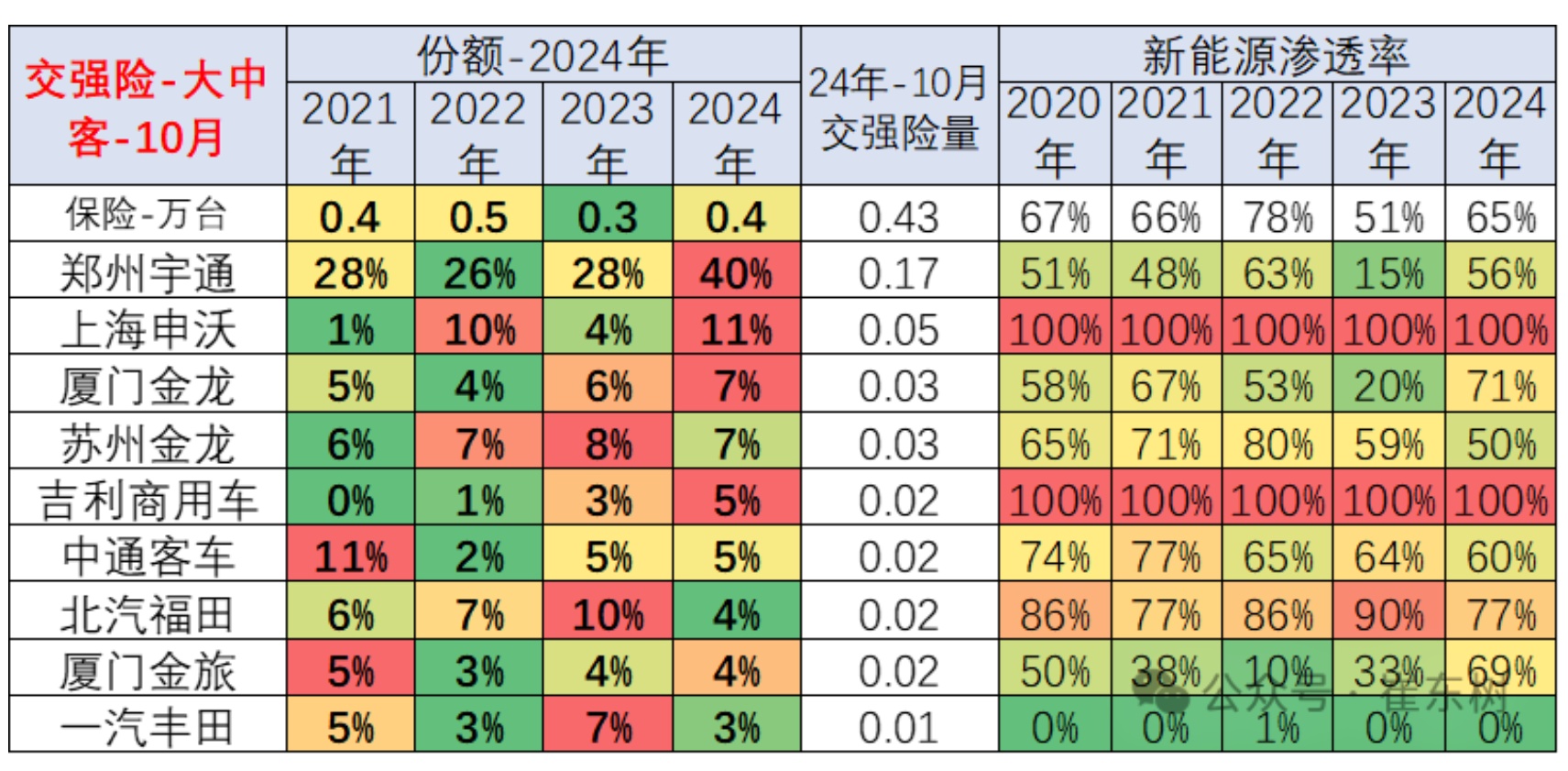 新能源大中客渗透率高的企业主要是二线企业,今年10月的上海申沃的客车表现很好。主力企业都是燃油车的新能源全面发展的,且主力企业的燃油车市场不错。