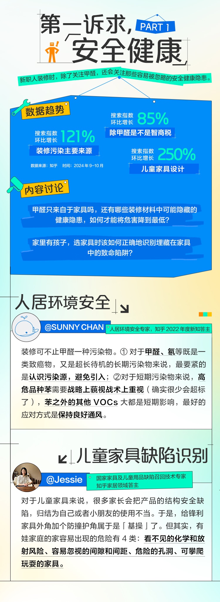 越来越多的新职人,关注装修中除了甲醛,还有什么容易被忽略的安全健康隐患,从知乎2024年9-10月数据反映,“装修污染主要来源”“除甲醛是不是智商税”“儿童家居设计”搜索指数环比增长分别为121%、85%和250%,这反映出“安全健康”是新职人群体的第一诉求。
