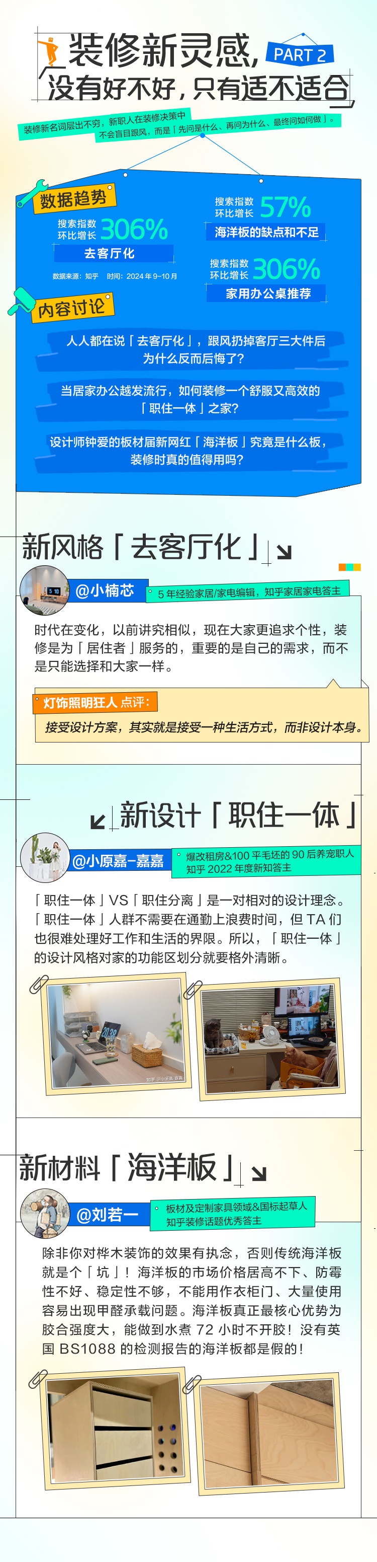《新职人装修图鉴》报告显示,“装修新灵感”成为新职人群体关注的另一大重点,知乎2024年9-10月数据显示“去客厅化”“家用办公桌推荐”“海洋板的缺点和不足”搜索指数环比增长分别为306%、306%和57%。知乎答主“小楠芯”表示,“时代在变化,以前讲究相似,现在大家更追求个性,装修是为居住者服务的,重要的是自己的需求,而不是只能选择和大家一样”。