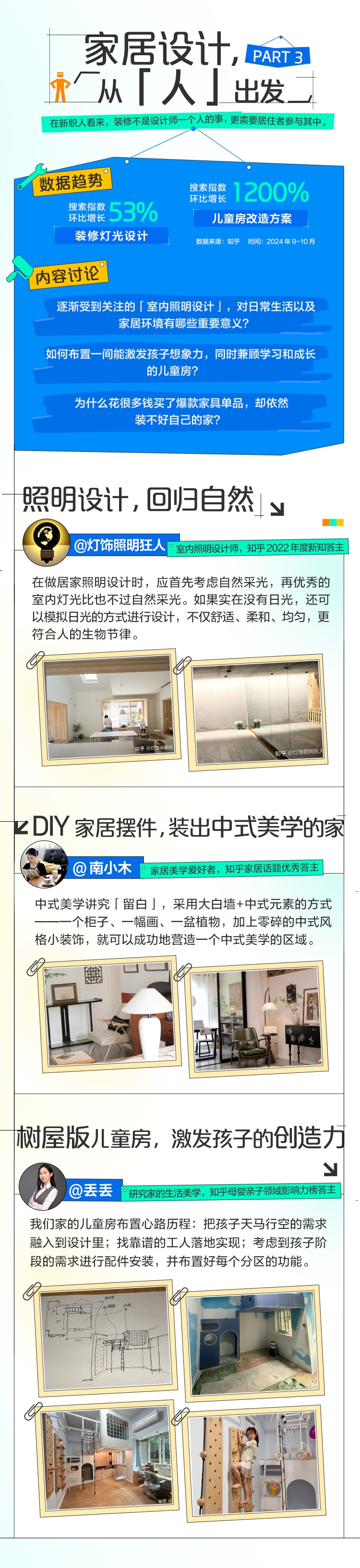 在新职人看来,装修不是设计师一个人的事,更需要居住者参与其中。《新职人装修图鉴》报告显示,“家居设计,从人出发”越发受到重视,其中包括“照明设计,回归自然”“DIY家居摆件,装出中式美学的家”以及“树屋版儿童房,激发孩子的创造力”等内容。