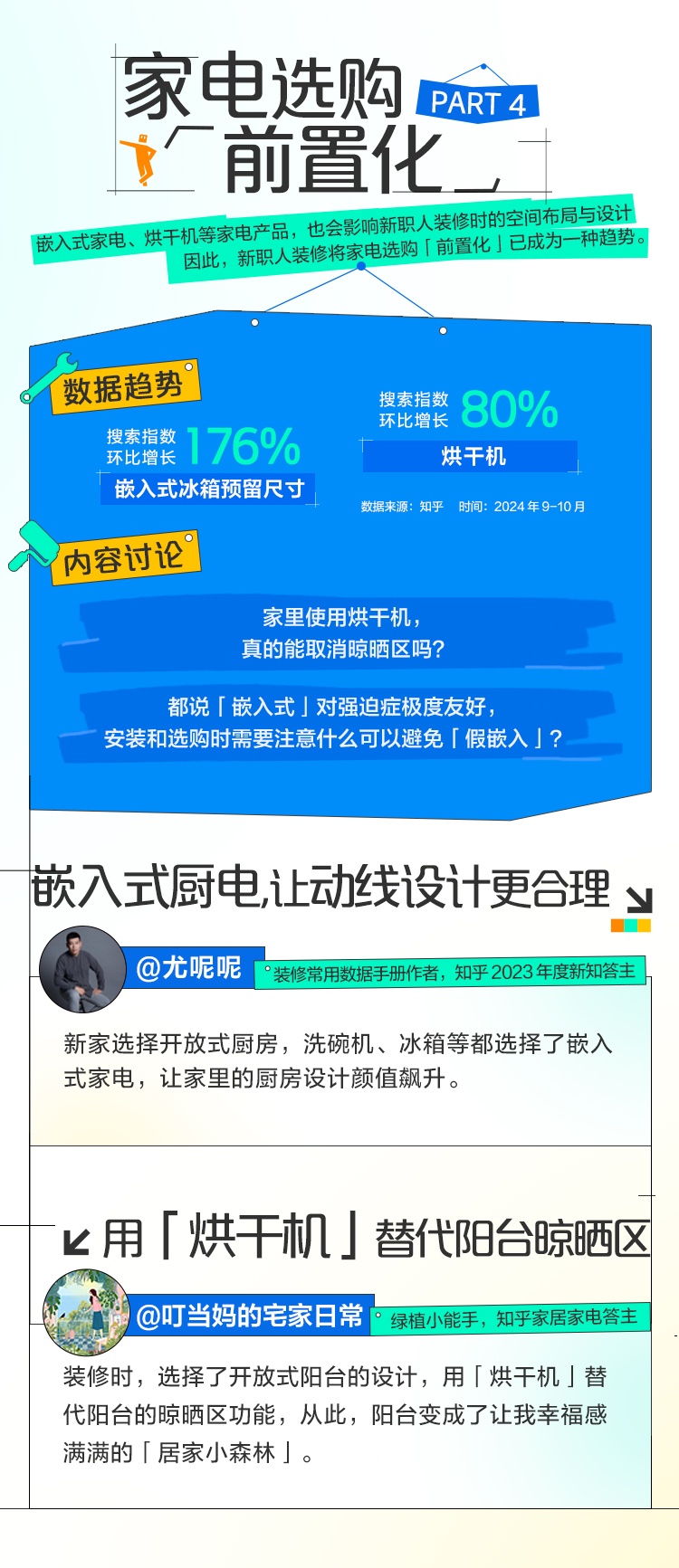 此外“家电选购前置化”也成为《新职人装修图鉴》重点关注的内容,据知乎搜索数据和站内讨论内容来看,嵌入式家电、烘干机等家电产品,会影响新职人装修时的空间布局与设计,因此新职人装修将家电选购前置化已成为一种趋势,又如在具体家庭区内,让动线设计更合理的嵌入式厨电、用烘干机替代阳台晾晒区成为了更多人的选择。
