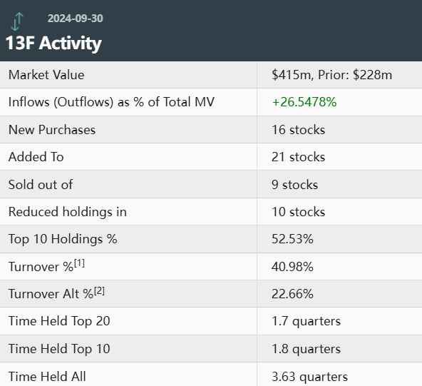 据统计,该基金第三季度持仓总市值为4.15亿美元,上一季度总市值为2.28亿美元,环比增长82%。该基金在第三季度的持仓组合中新增了16只个股,增持了21只个股。同时,该基金减持10只个股,清仓9只个股。其中,前十大持仓标的占总市值的52.53%。