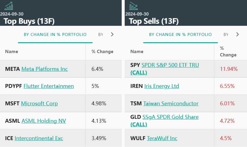总的来看,按占投资组合比例变化计算,该公司前五大买入标的分别是:Meta(META.US)、Flutter Entertainmen(FLUT.US)、微软(MSFT.US)、阿斯麦(ASML.US)、洲际交易所(ICE.US)。