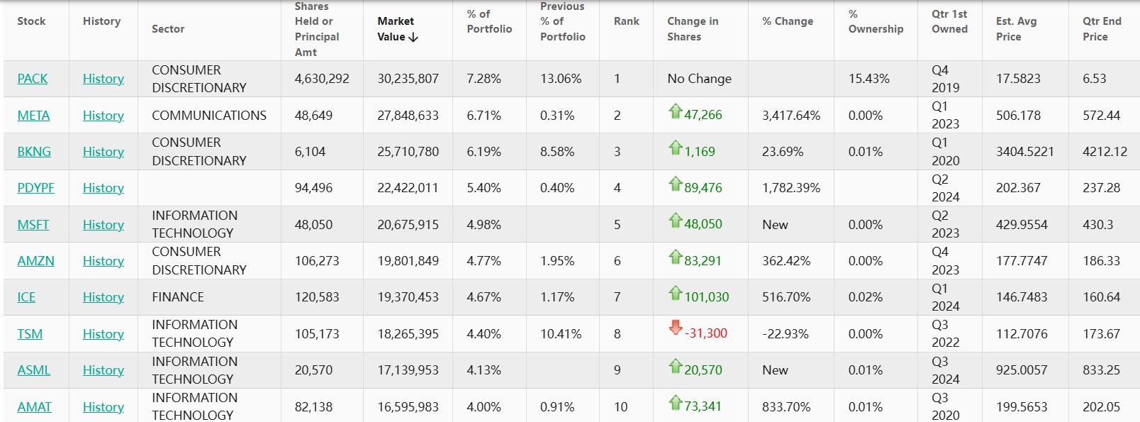 在重仓股中,Ranpak Holdings(PACK.US)以占投资组合比例7.28%位列第一,持仓463万股,持仓市值约3023万美元,持仓没有变化。