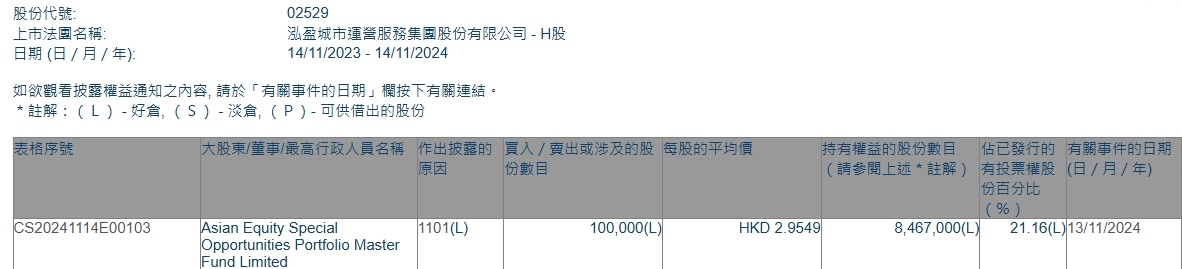 智通财经APP获悉,香港联交所最新资料显示,11月13日,Asian Equity Special Opportunities Portfolio Master Fund Limited增持泓盈城市服务(02529)10万股,每股作价2.9549港元,总金额约为29.55万港元。增持后最新持股数目为846.7万股,最新持股比例为21.16%。