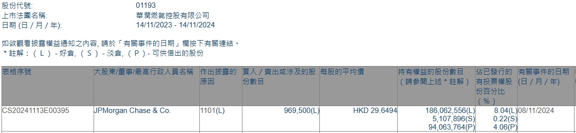 智通财经APP获悉,香港联交所最新资料显示,11月8日,摩根大通增持华润燃气(01193)96.95万股,每股作价29.6494港元,总金额约为2874.51万港元。增持后最新持股数目约1.86亿股,最新持股比例为8.04%。