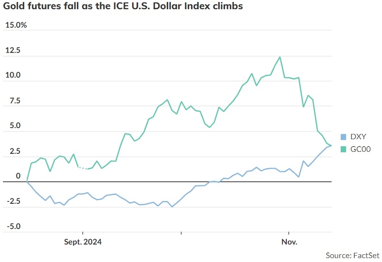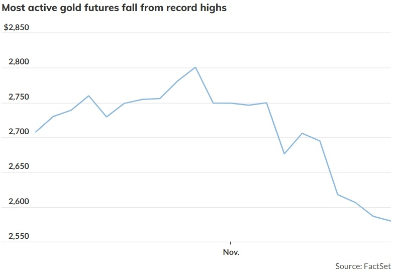 根据道琼斯市场数据,10月30日,黄金期货(最活跃合约)的结算价创下了每盎司2800.80美元的历史高位。然而,周四的12月合约结算价为2572.90美元,单日下跌13.6美元或0.5%,创下自9月11日以来的最低水平,距历史高点仅两周已累计下跌8.1%。