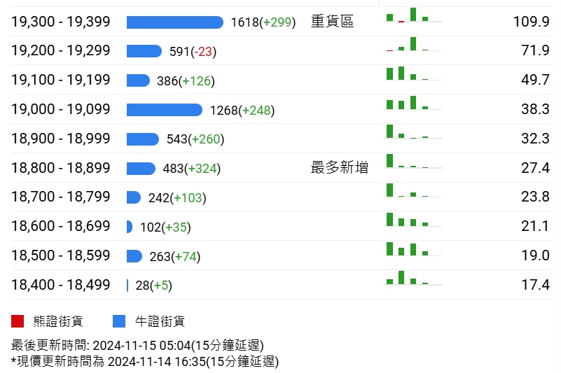 牛证街货重货区在19300-19399区间,该区间最新牛证数量为1618张,较上一交易日增加299张;最多新增在18800-18899区间,该区间最新牛证数量为483张,较上一交易日增加324张。