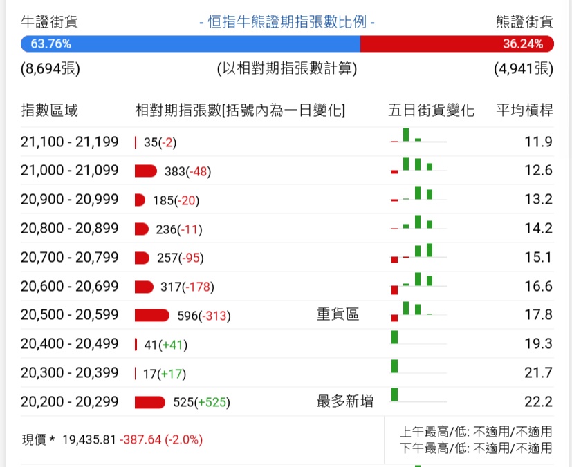 中信证券牛熊证街货分布图中的数据显示,熊证街货重货区在20500-20599区间,该区间最新熊证数量596张,较上一交易日减少313张;最多新增在20200-20299区间,该区间最新熊证数量为525张,较上一交易日增加525张。