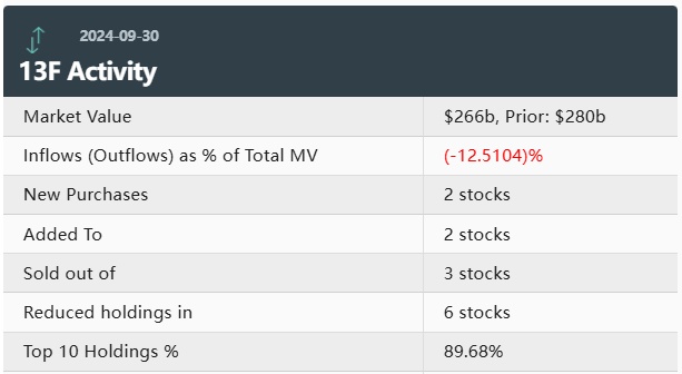据统计,伯克希尔哈撒韦第三季度持仓总市值达2660亿美元,上一季度总市值为2800亿美元,环比下降5%。伯克希尔在第三季度的持仓组合中新增了2只个股,增持了2只个股。同时,伯克希尔减持6只个股,清仓3只个股。其中,前十大持仓标的占总市值的89.68%。