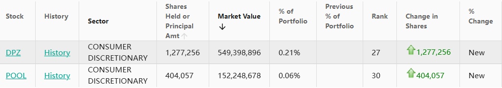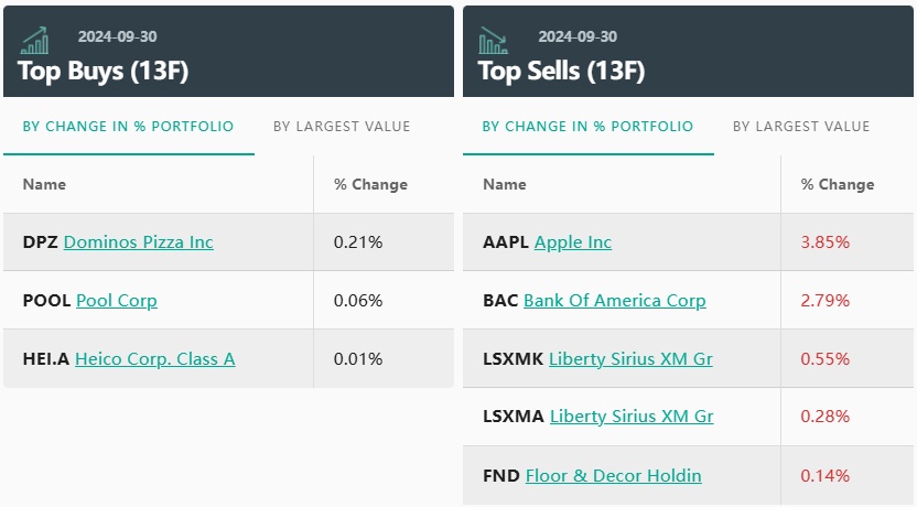 从持仓比例变化来看,前三大买入标的分别是:达美乐比萨、Pool Corp、海科航空(HEI.A.US)。
