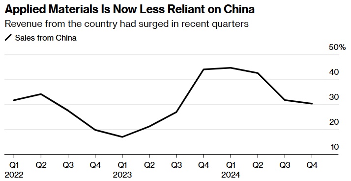 应用材料公司在中国的收入也有所下滑。该公司最近几个季度来自中国的订单激增,部分原因是对存储芯片设备的需求。应用材料公司说,市场仍然健康。上个季度,中国占该公司总销售额的30%,低于上年同期的44%。