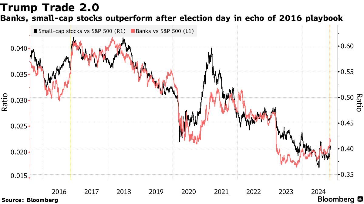 “特朗普交易”这一概念在特朗普2016年首次赢得总统大选后开始流行,随后美股和美元飙升——这与本月大选后的情况类似。与8年前的情况类似的情况还有,受到监管将放松的预期的提振,银行股是上涨最快的板块之一,而小盘股则因对减税和投资相关政策承诺的乐观情绪而大幅上涨。更广泛地说,这些举动表明,投资者对特朗普政府刺激经济增长和企业利润的政策抱有信心。