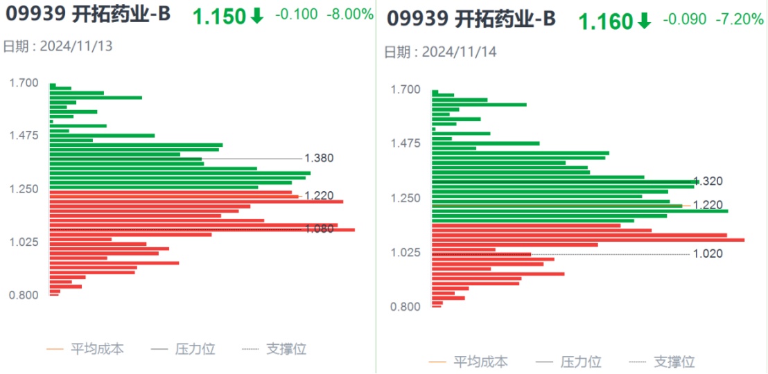 从筹码分布图来看,11月13日在开拓药业股价回踩时,筹码峰依旧保持在1.22港元平均成本附近,可见在大量低吸资金抄底下,已在短期内形成一个较大的获利区域,超过7成的筹码集中在1.04-1.42港元间,获利比例为56.23%。但到11月14日的下跌行情中,依旧保持了高位筹码峰,说明依旧存在大量的套牢盘压力。