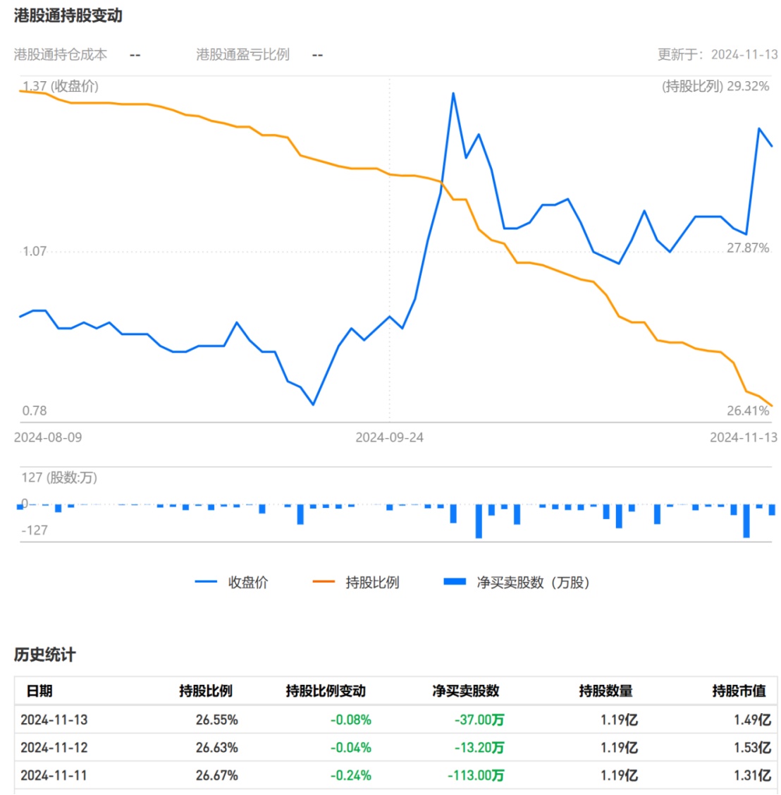 从开拓药业的港股通持股比例来看,虽然今年以来,其港股通持股比例一路下滑,但截至11月13日依旧还有26.55%,由其形成的巨大抛压盘或会对开拓药业后续的股价波动中造成持续的负面影响。