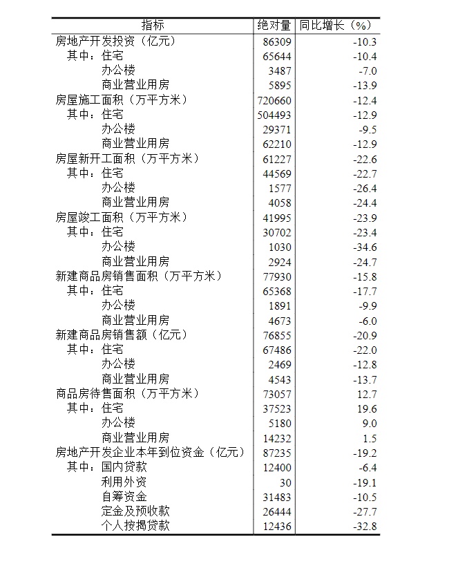 1—10月份,房地产开发企业房屋施工面积720660万平方米,同比下降12.4%。其中,住宅施工面积504493万平方米,下降12.9%。房屋新开工面积61227万平方米,下降22.6%。其中,住宅新开工面积44569万平方米,下降22.7%。房屋竣工面积41995万平方米,下降23.9%。其中,住宅竣工面积30702万平方米,下降23.4%。