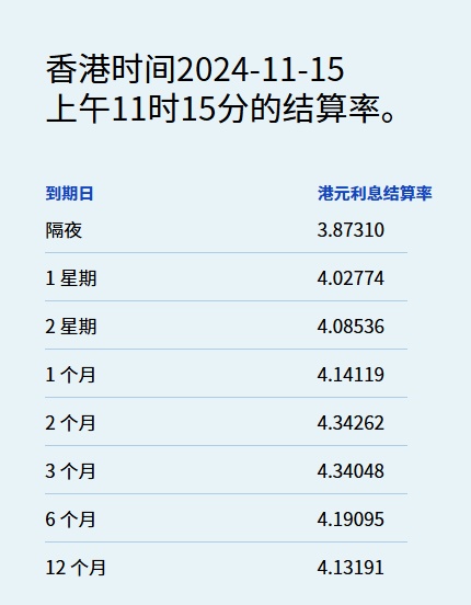 智通财经APP获悉,11月15日,港元拆息普遍微升,其中,与楼按相关的一个月拆息连升两天,报4.14119%,见两周新高,但隔夜息回落5基点至3.8731%。