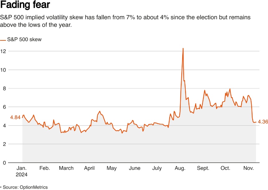 例如,标普500指数的一个偏度指标——衡量买入看涨期权与卖出看跌期权的相对需求——已从大选前的7%降至4%,表明投资者的防御意识有所下降。但在今年的不同时期,这一指标甚至更低,包括5月,当时为3%。