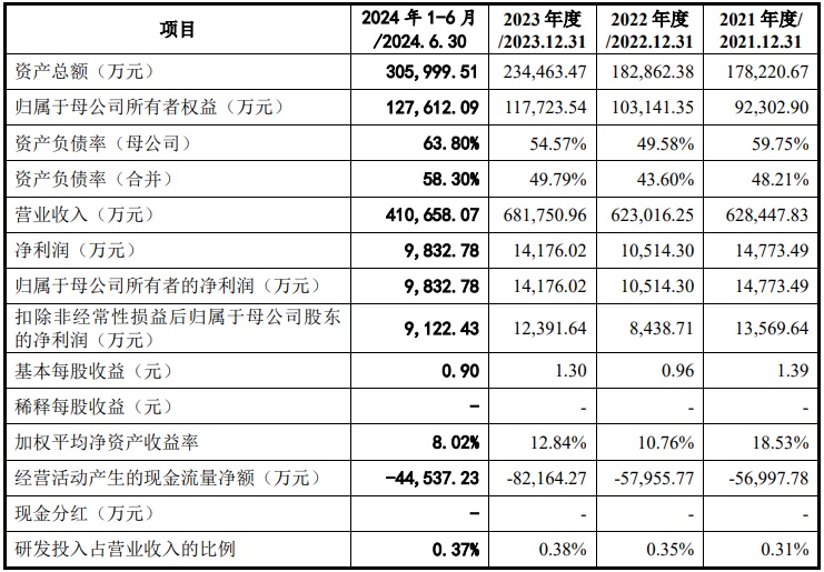 财务方面,于2021年度、2022年度、2023年度、2024年1-6月,江南新材实现营业收入分别约为62.84亿元、62.3亿元、68.18亿元、41.07亿元。同期,该公司实现净利润分别约为1.48亿元、1.05亿元、1.42亿元、9832.78万元。