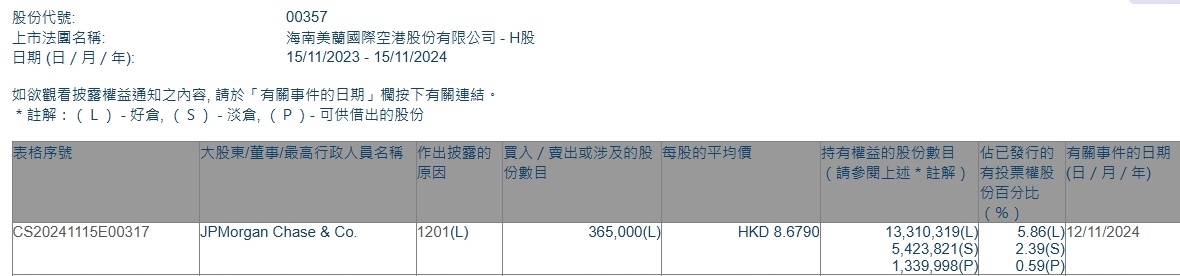 智通财经APP获悉,香港联交所最新资料显示,11月12日,小摩减持美兰空港(00357)36.5万股,每股作价8.679港元,总金额约为316.78万港元。减持后最新持股数目约为1331.03万股,最新持股比例为5.86%。