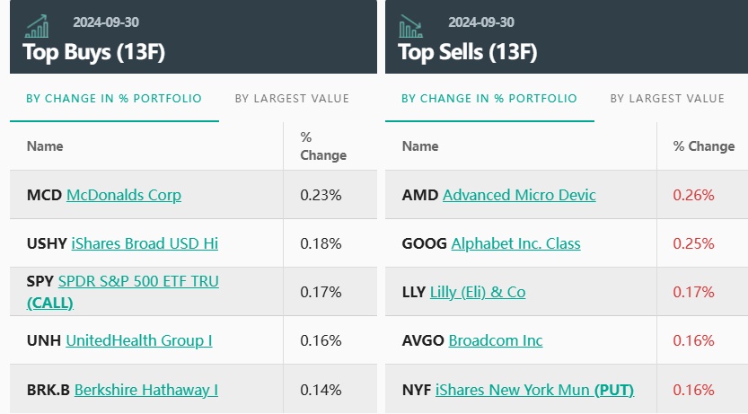 从持仓比例变化来看,小摩前五大买入标的分别是:麦当劳(MCD.US)、iShares Broad USD 高收益公司债券 ETF(USHY.US)、SPDR标普500指数ETF看涨期权、联合健康以及大举增持“股神”巴菲特旗下的伯克希尔哈撒韦B(BRK.B.US)。前五大卖出标的分别是:AMD(AMD.US)、谷歌(GOOG.US)、礼来、博通(AVGO.US)以及iShares 纽约市政债券 ETF (NYF.US)。
